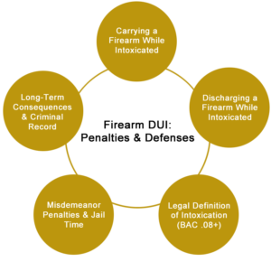 A charge of Carrying a Firearm While Intoxicated is considered a misdemeanor, with a jail sentence up to 12 months and/or fines up to $1,000 as well as potential community service and mandatory firearm safety courses or substance abuse counseling. A judge will often grant probation, with certain conditions that must be met to avoid jail time, but a conviction will still remain a part of a permanent criminal record with long-term effects on employment and firearm rights.